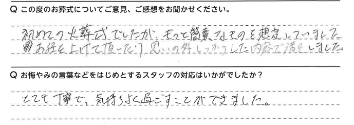 A.M様、ご葬儀のお手伝いにおいて、大変ありがたいお言葉を頂戴し誠にありがとうございます。これからも「良い式」と感じて頂けますよう、社員一同向上して参ります。 何かご不明な点やご不安なことがございましたら、いつでもお気軽にご連絡ください。